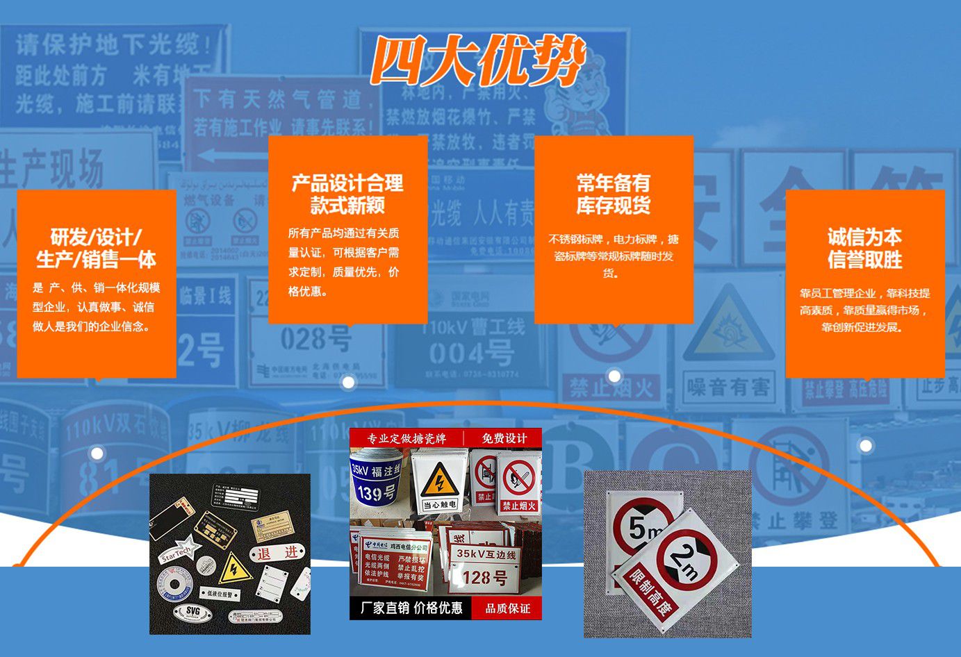 安徽峰銘標(biāo)牌有限公司成立于2018年,2020年成立峰銘標(biāo)牌山東分公司,是致力于標(biāo)牌生產(chǎn)研發(fā)的專業(yè)企業(yè)。峰銘標(biāo)牌多年來(lái)一直專注于標(biāo)牌及印刷事業(yè),擁有完善的生產(chǎn)技術(shù)和先進(jìn)的生產(chǎn)設(shè)備,有多名金屬科研單位和標(biāo)牌專業(yè)、標(biāo)牌企業(yè)從業(yè)經(jīng)歷人才,是專注于標(biāo)牌標(biāo)識(shí)及印刷品生產(chǎn)的專業(yè)型企業(yè)。 公司主要產(chǎn)品:腐蝕標(biāo)牌,搪瓷標(biāo)牌,絲印標(biāo)牌,UV標(biāo)牌,反光標(biāo)牌,不銹鋼標(biāo)牌,鋁合金標(biāo)牌,PVC標(biāo)牌,亞克力標(biāo)牌,高光標(biāo)牌,堆金標(biāo)牌,烤漆標(biāo)牌,電力標(biāo)牌,電廠標(biāo)牌,電網(wǎng)標(biāo)牌,通信標(biāo)牌,安全警示牌,相序牌,塔號(hào)牌,桿號(hào)牌,刀閘牌,閥門牌,銘牌,面板牌。交通標(biāo)牌,交通標(biāo)志牌,高速路標(biāo)牌,道路標(biāo)牌,路名牌,限速牌,限高牌,三維立體軟標(biāo),熱轉(zhuǎn)印標(biāo)牌。地產(chǎn)標(biāo)牌,鋼廠標(biāo)牌,宣傳欄,精神堡壘,不銹鋼扎帶,廣告字,水晶字,沖孔字,彩頁(yè)畫(huà)冊(cè)、不干膠印刷等專業(yè)生產(chǎn)。 近年來(lái),我公司堅(jiān)持“科技興廠”的方針,引進(jìn)先進(jìn)的生產(chǎn)設(shè)備和技術(shù),嚴(yán)格執(zhí)行國(guó)家及行業(yè)標(biāo)準(zhǔn),專注同行加工業(yè)務(wù),與時(shí)俱進(jìn),打造出了一系列精美產(chǎn)品。我公司已通過(guò)ISO9001質(zhì)量管理體系認(rèn)證,我們將繼續(xù)貫徹“誠(chéng)信經(jīng)營(yíng)、保質(zhì)保量、交貨迅速”的方針為您提供更優(yōu)質(zhì)的服務(wù)。 目前我司和國(guó)內(nèi)較多大中型電廠、電力公司、鋼鐵企業(yè)、通信企業(yè)、車輛企業(yè)、公路交通、機(jī)電設(shè)備、廣告公司同行加工等形成了...